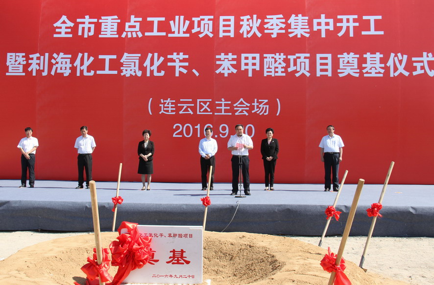 920日,我市重點工業項目秋季集中開工(連云區主會場)暨利海化工氯化芐、苯甲醛項目奠基儀式在利海公司舉行,市委書記、市人大常委會主任楊省世,市領導楊莉、董恕娟、徐家保、魯林,集團公司董事長、黨委書記楊龍、總經理胡建明等出席開工儀式。