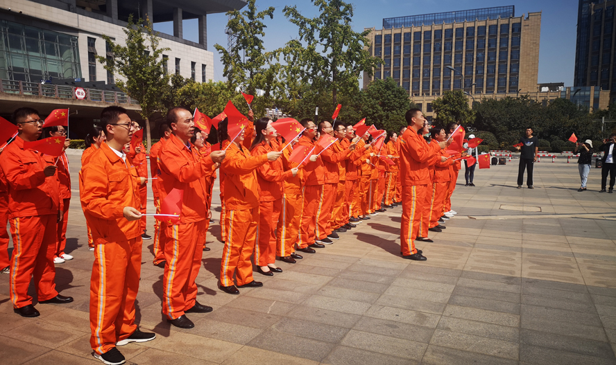 活動現場,身著亮橙色工作服的華茂員工,人手一面紅旗,不少青年員工在臉上身上貼上各式小紅旗,眾多圍觀群眾和往來旅客紛紛被氣氛感染自發加入宣傳隊伍,共同唱起《我和我的祖國》,大家臉上洋溢的不只是自豪,更是努力干事創業的動力。