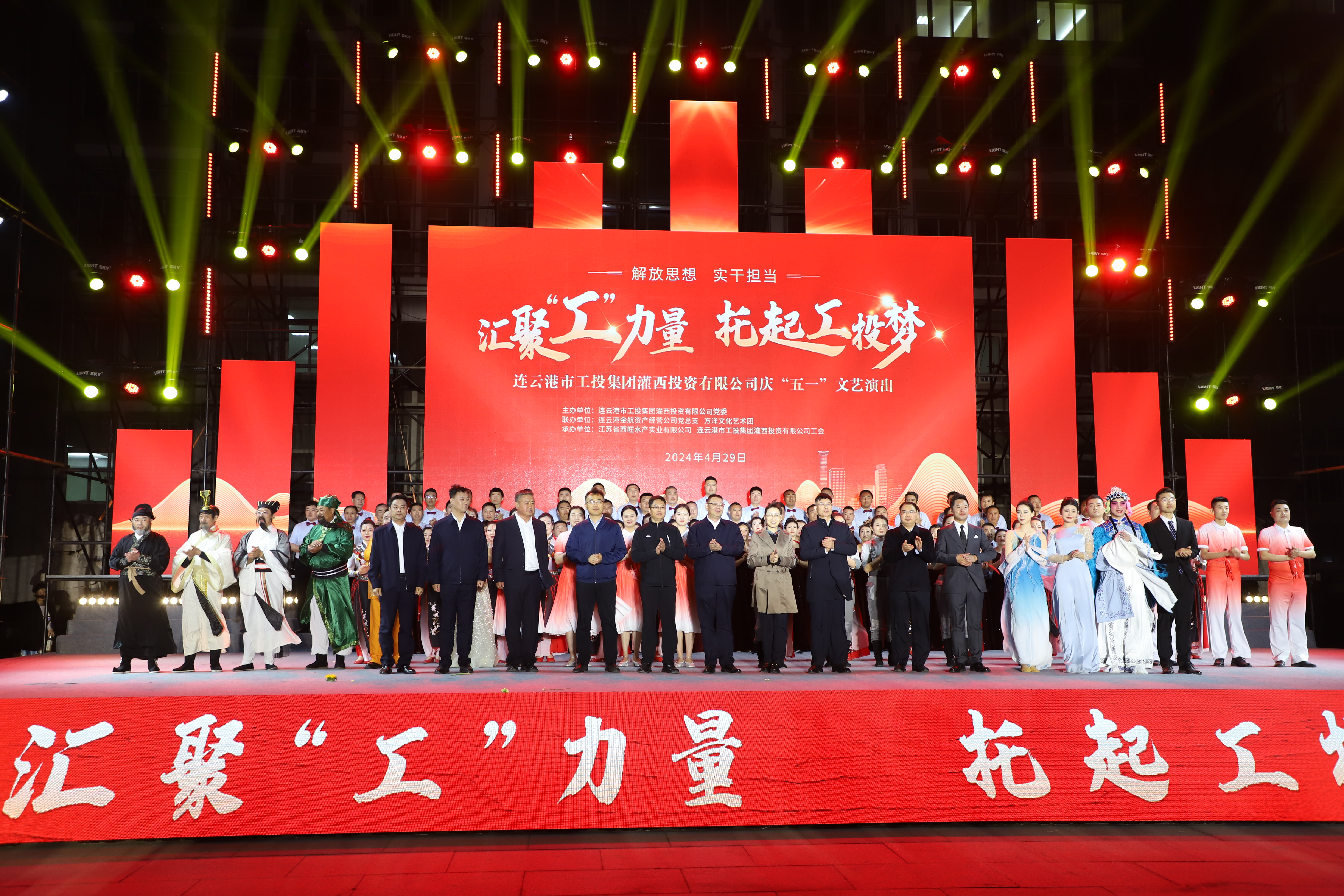 4月29日晚,灌西投資公司《匯聚“工”力量,托起工投夢》慶“五一”文藝演出在機(jī)關(guān)大樓前廣場舉行。本次活動(dòng)由灌西投資公司黨委主辦,連云港金航資產(chǎn)經(jīng)營公司黨總支、方洋文化藝術(shù)團(tuán)聯(lián)辦,旨在通過藝術(shù)的形式,營造崇尚勞模、學(xué)習(xí)先進(jìn)、尊重勞動(dòng)的良好氛圍,豐富公司員工的文化生活,激發(fā)干事創(chuàng)業(yè)熱情。集團(tuán)公司領(lǐng)導(dǎo)張六林、戴鴻鳴、汪群及部分部門負(fù)責(zé)人,灌西、金航資產(chǎn)經(jīng)營公司領(lǐng)導(dǎo)班子成員出席演出活動(dòng),縣臨港產(chǎn)業(yè)區(qū)管委會(huì)、華能灌云清潔能源發(fā)電責(zé)任有限公司、徐圩新區(qū)方洋集團(tuán)等有關(guān)領(lǐng)導(dǎo)受邀觀看演出。