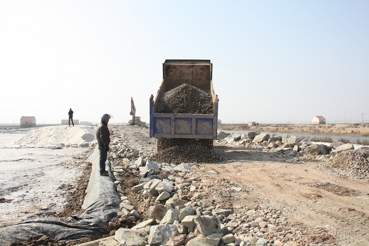 2月15日,在新河制鹽公司七至十班運(yùn)鹽路施工現(xiàn)場(chǎng),我們看到南翼公司項(xiàng)目工程分公司的員工正在指揮兩臺(tái)小型工程車將石子傾倒在路基上,兩臺(tái)挖掘機(jī)正忙于將運(yùn)送來的石子整平。運(yùn)鹽河對(duì)面,三輛滿載土夾石的大型工程車一字排開,正等待卸載。據(jù)了解,目前正在施工的是新河制鹽分公司二期運(yùn)鹽路維修改造工程,該工程改造路段全長(zhǎng)3300米,計(jì)劃總投資193萬元,其中路基鋪設(shè)部分由日曬制鹽公司出資45萬元,路面部分則由縣交通局承擔(dān),預(yù)計(jì)需要投入148萬元。該工程于去年底開始施工,預(yù)計(jì)三月中下旬全部鋪設(shè)完成。另外新河制鹽分公司一期一至十二班3300米運(yùn)鹽路改造工程計(jì)劃將于今年下半年實(shí)施。