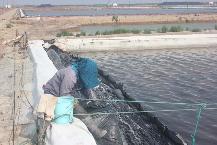 我們首先來到新河制鹽分公司十二班,映入我眼簾的是一位女工頭頂烈日坐在灘頭認真修補塑料布,她用毛巾將破損地方擦拭干凈,待水漬干透,涂抹上膠水,再將一塊新的布粘貼上去,技藝十分嫻熟。