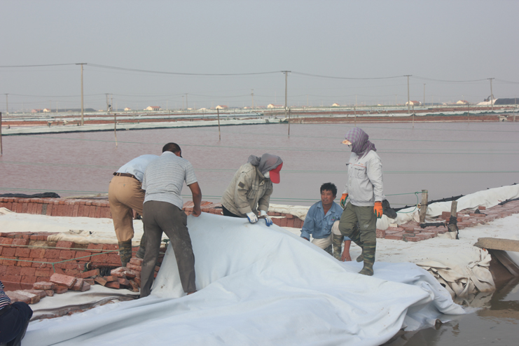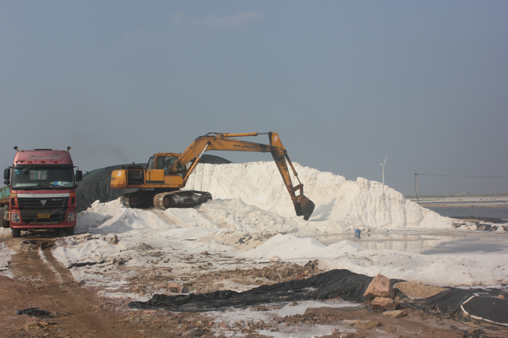 隨后我們又來到了新河制鹽分公司十四班的裝鹽現場。一位工人操作著挖掘機,往卡車上裝鹽銷售,如今裝鹽實現了機械化,工人的勞動負荷也減輕了許多。在埒南制鹽分公司的五班,我們看到七八個工人正在灘頭更換土工布,他們一字排開,先將土工布鋪開,然后分工合作,有的人負責把布理齊鋪平,有的則把磚頭鋪放在布上用來固化。