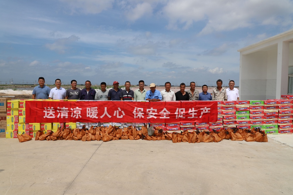 7月中旬的鹽場灘頭,烈日是毫無情面的主宰,把鹽田曬得泛出刺目的白光,那光里藏著鹽分的結晶,也藏著蒸騰的暑氣。公司黨委書記、董事長孫政權帶領慰問組來到這里時,鹽工們正在這片光與熱中專注地除硫、修復抗災設施?!皫煾祩冃量嗔耍∵@么熱的天可得注意防暑!”孫政權快步走上前,將裝有綠豆、白糖的“清涼禮包”遞到職工手中,手掌觸碰到他們被汗水浸濕的工裝,他不禁加重了語氣叮囑道:“一定要合理安排作息時間,千萬別硬扛著,只有保持身體健康,才能以充沛的體力和飽滿的熱情投入到安全生產等各項工作中去?!?/span>