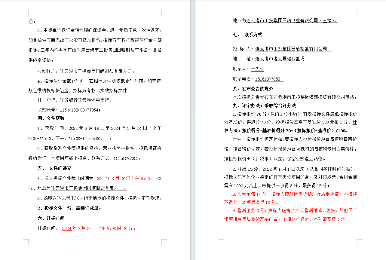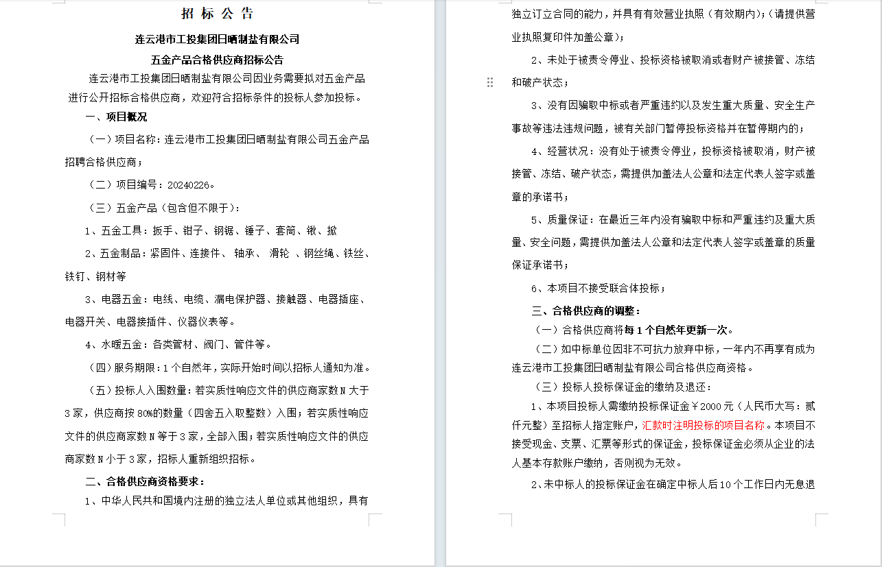 連云港市工投集團日曬制鹽有限公司五金產品合格供應商招標公告