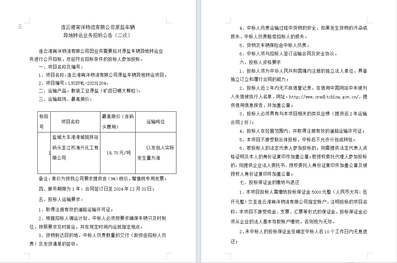 連云港宵洋物流有限公司原鹽車輛 異地轉運業務招標公告(二次)