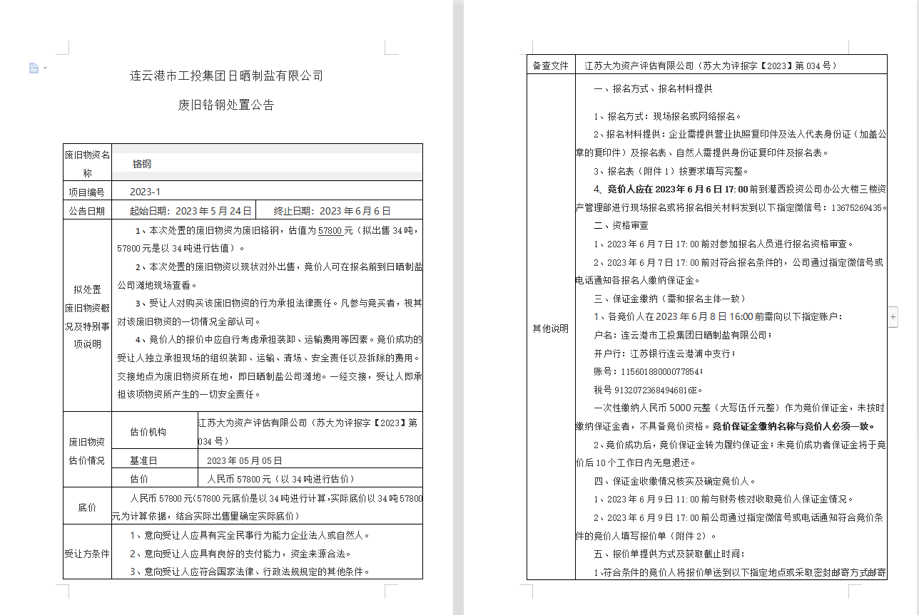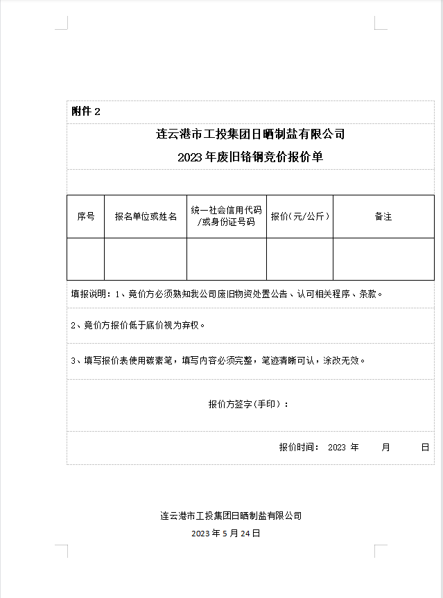 連云港市工投集團日曬制鹽有限公司廢舊鉻鋼處置公告