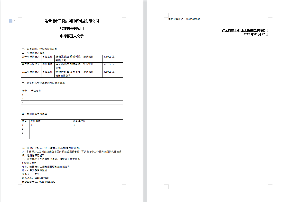 連云港市工投集團(tuán)日曬制鹽有限公司收放機(jī)采購(gòu)項(xiàng)目中標(biāo)候選人公示