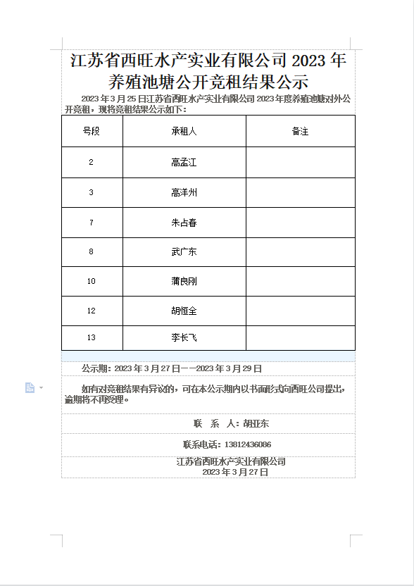 江蘇省西旺水產(chǎn)實(shí)業(yè)有限公司2023年養(yǎng)殖池塘公開競租結(jié)果公示