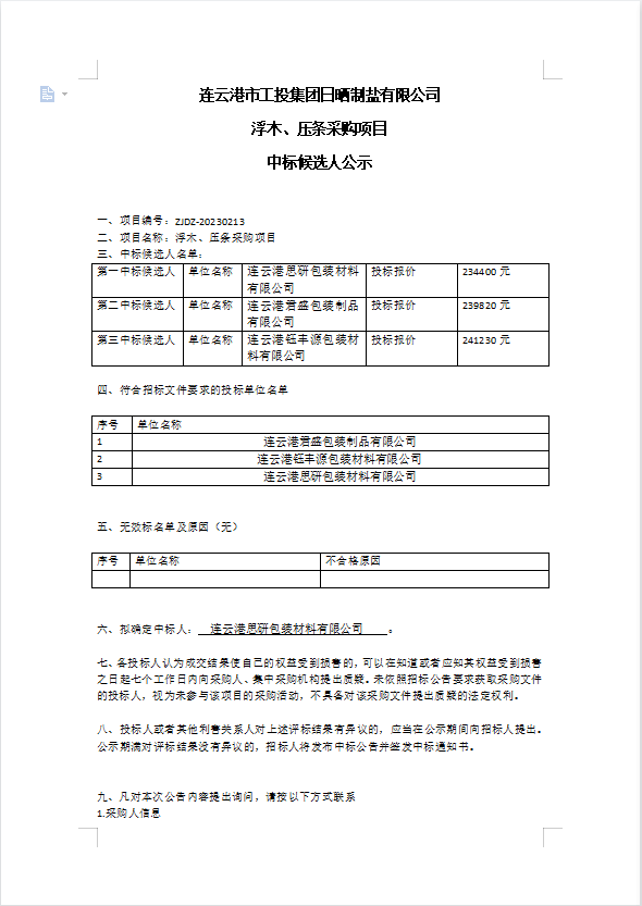 連云港市工投集團日曬制鹽有限公司浮木、壓條采購項目中標候選人公示
