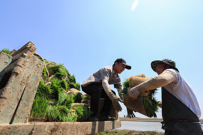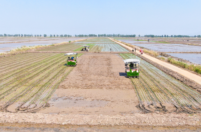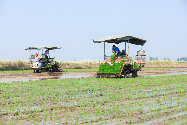芒種時節,又到一年夏種高峰時期,青口公司進入插秧忙的季節。水稻塑盤育秧經過近一個月的精心管理,秧苗長勢好,機器手正熟練地操作插秧機在稻田里穿梭,一撮撮青翠的秧苗被整齊有序地插在水田里,呈現出一幅綠色生態的耕種畫卷。