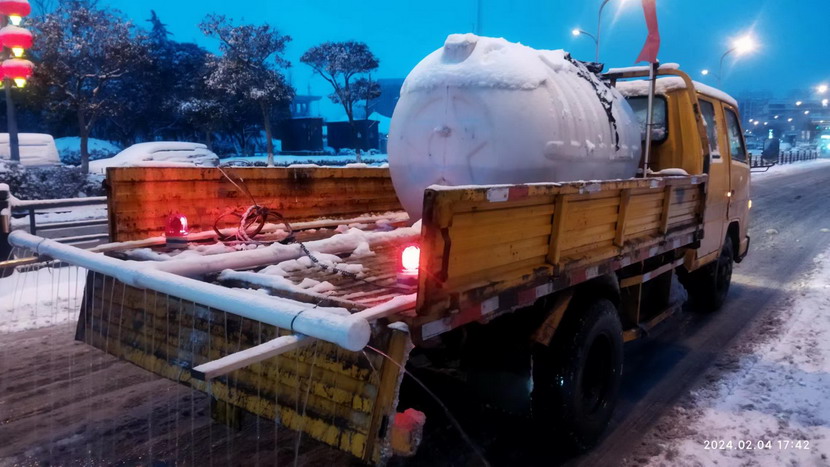 ? ? ? ? 今天(24日),港城普降暴雪,臺北華茂全員出動500余人次,大小機械100余臺(班),全力確保了轄區交通線暢通。這中間,出現一臺除雪“核武器”,這就是翔立分公司自制的鈣液噴淋除雪車。