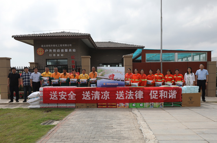 ????? 84日上午,市總工會副主席王悅到連云港綠化工程公司基層班組開展“送安全、送清涼、送法律”活動,走訪慰問堅守在高溫作業現場的市政養護職工,在送去防暑藥品、涼茶、礦泉水、綠豆、白糖、毛巾等防暑降溫物品的同時,為他們送去絲絲涼意誠摯的關懷。